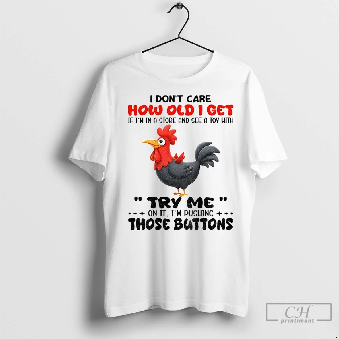 Chicken I Dont Care How Old I Get If Im In A Store And See A Toy With Try Me On It Im Pushing Those Buttons T Shirts