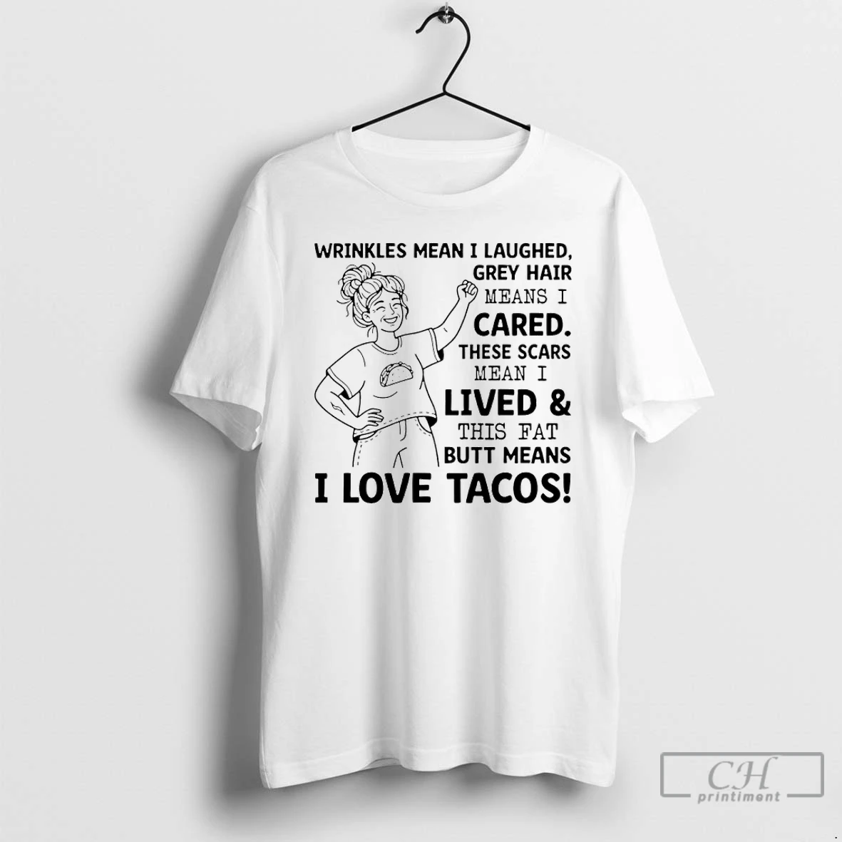 Premium Wrinkles Mean I Laughed Grey Hair Means I Cared These Scars Mean I Lived And This Fat Butt Means I Love Tacos T Shirts Sweater Hoodie
